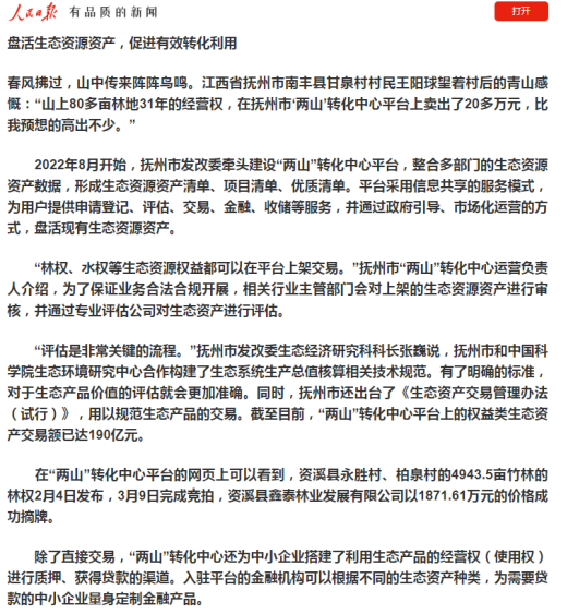 2024年3月21日,《人民日?qǐng)?bào)》以“盤活生態(tài)資源資產(chǎn),促進(jìn)有效轉(zhuǎn)化利用”為題,向全國(guó)推介“兩山”轉(zhuǎn)化中心平臺(tái)。